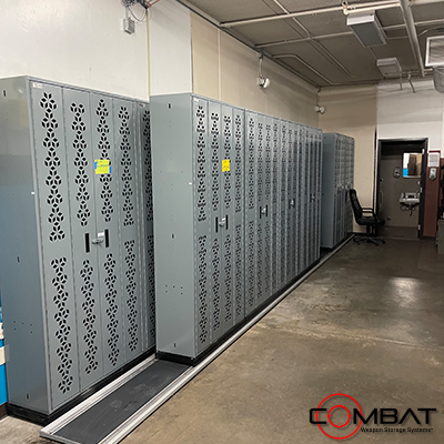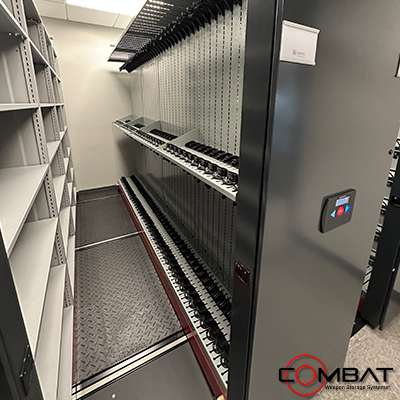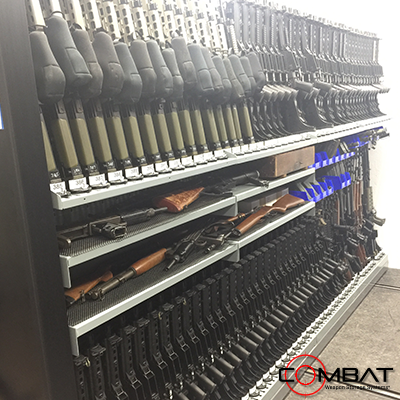 Mobile Weapon Shelving Systems allow for the greatest density of weapon storage over static weapon storage systems. By placing Combat Weapon Shelving onto moveable carriages, arms rooms, armories, crime labs, evidence vaults, property rooms and firearm manufacturers can store weapon systems in a compact and secure organized fashion.