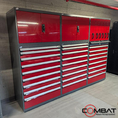 In some cases, we have integrated shelving storage systems into high density weapon storage systems with the carriages locking down the system providing additional security for the items.